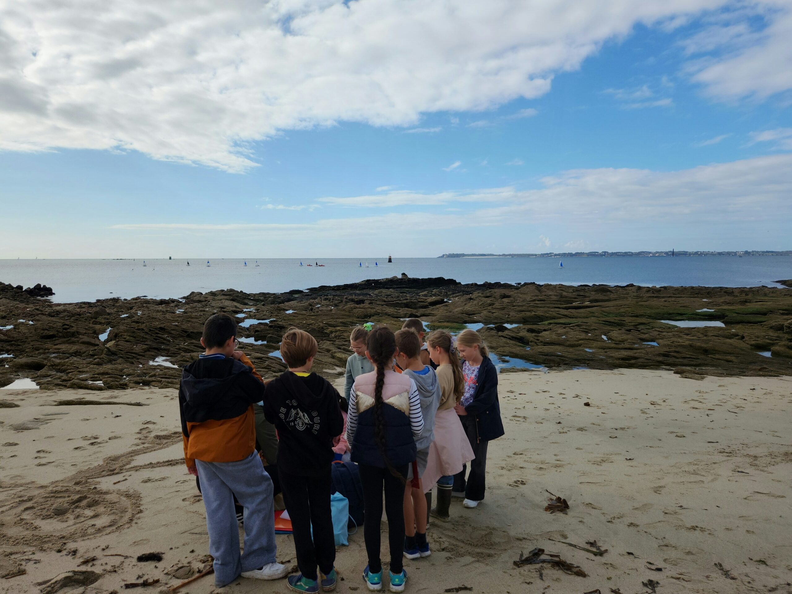 La 1ère séance a eu lieu en septembre 2025 avec une sortie d’exploration du site, suivie d’un conseil des élèves afin de choisir des thématiques de travail pour ce début d’année. Les écoliers souhaitent observer l’eau, le sable, le plancton et également découvrir les navires de la rade de Lorient.